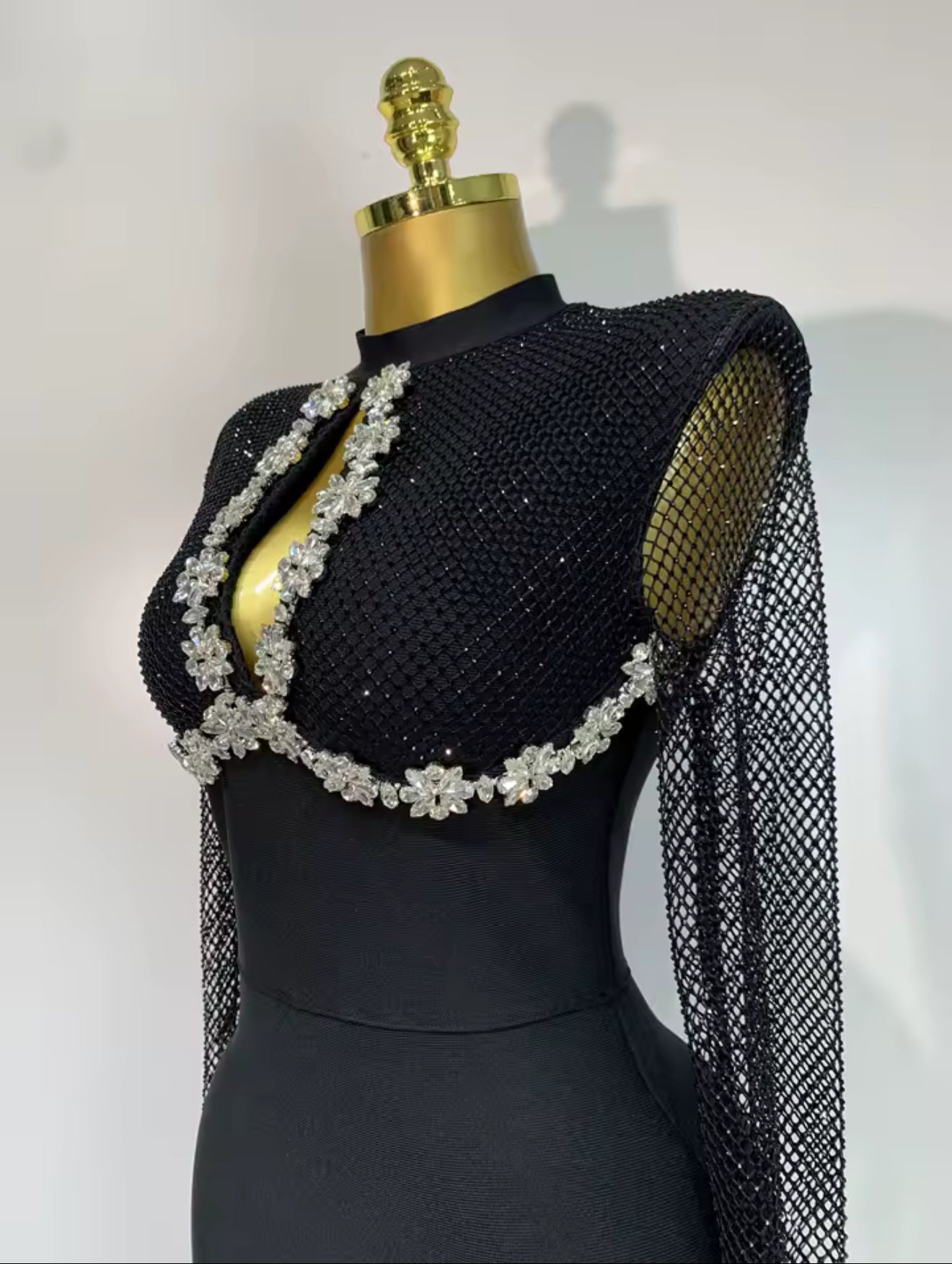 The fitted bodice is accented with delicate crystal trim beneath the bust, enhancing the silhouette while adding a luminous touch. Sheer mesh long sleeves bring balance and refinement, creating a sleek and elongating effect. The floor-length skirt completes the look with a smooth, body-contouring finish.