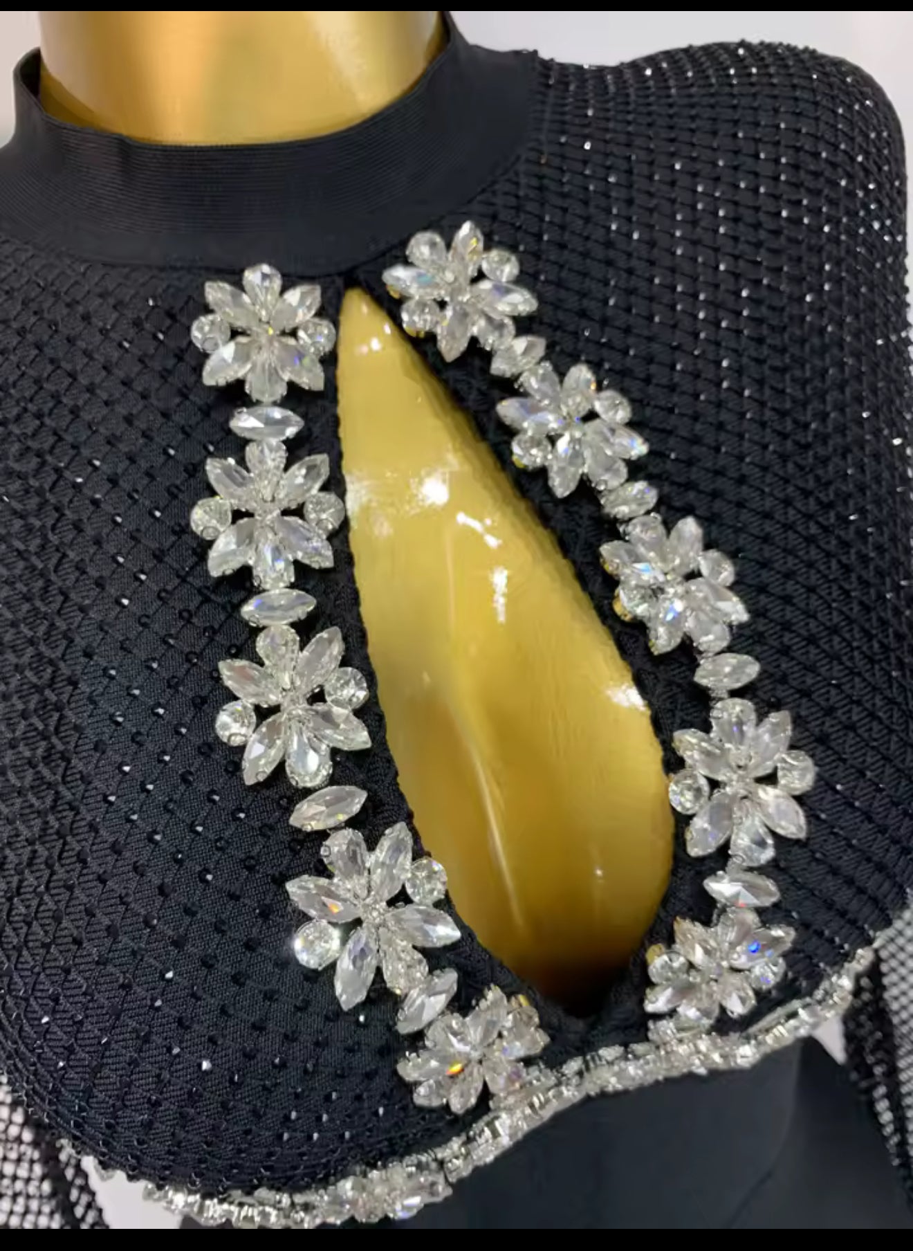 - Neckline: High neck with crystal-embellished cutout