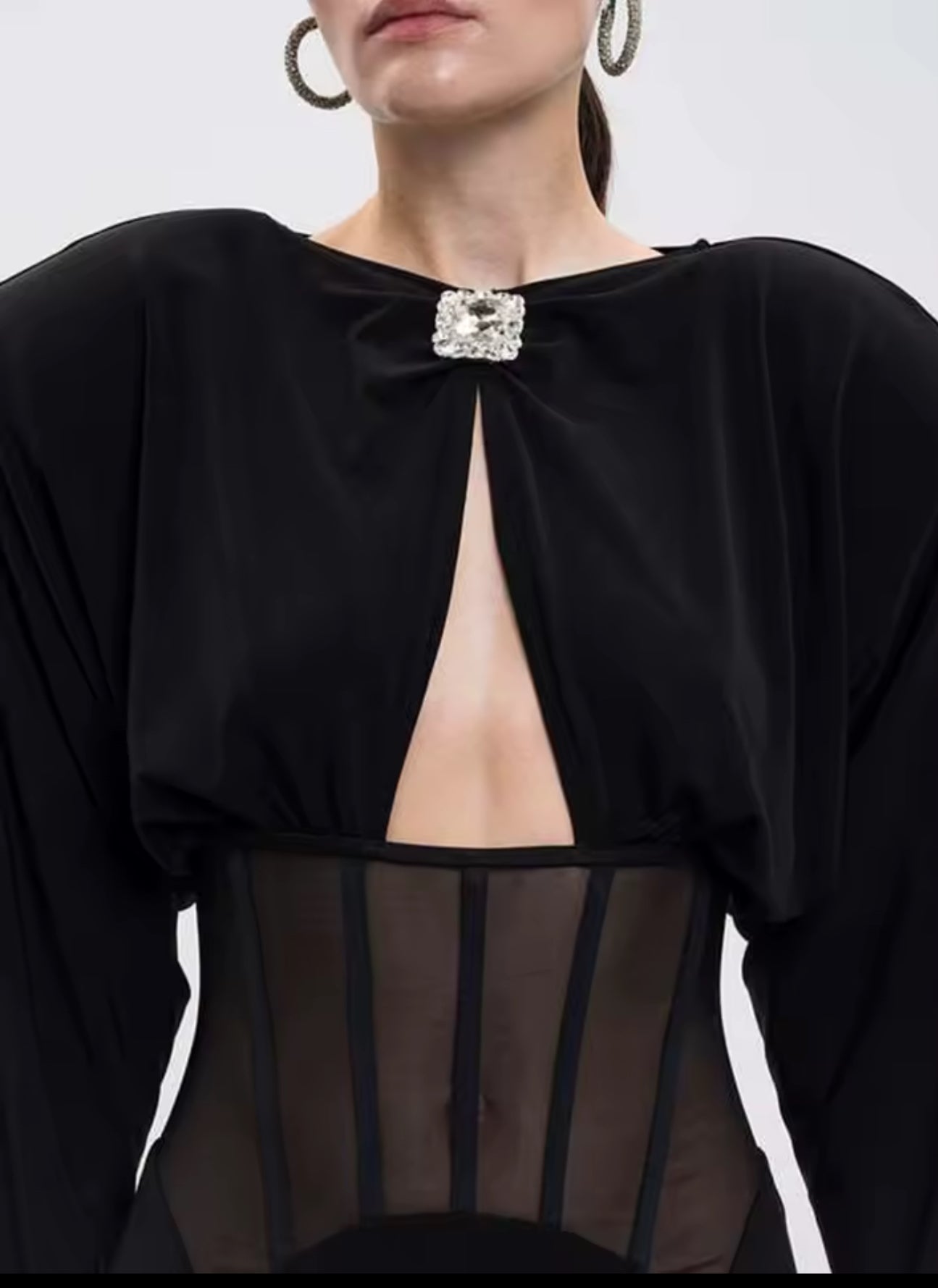 - Waist: Sheer mesh corset panel that enhances the waistline and adds a hint of allure