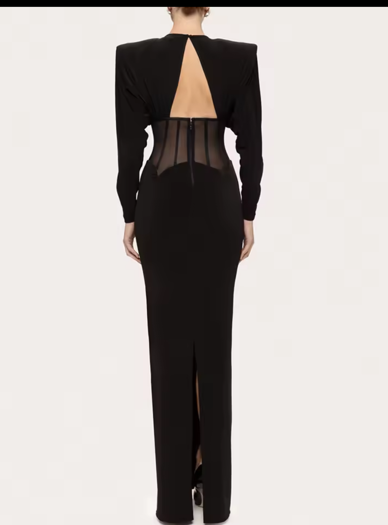 - Design: Long-sleeve fitted gown with structured shoulders for a powerful yet feminine look