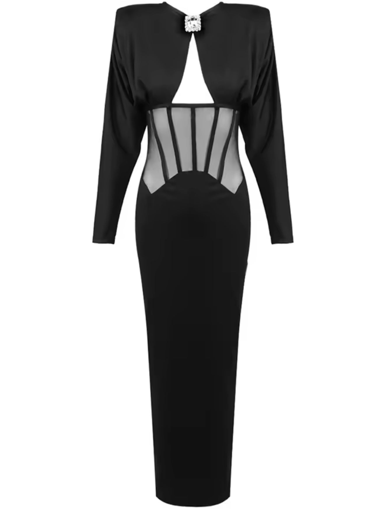 - Neckline: Bold front cutout with a crystal accent clasp for a touch of glamour